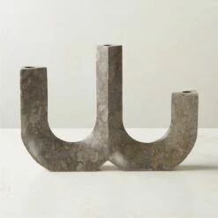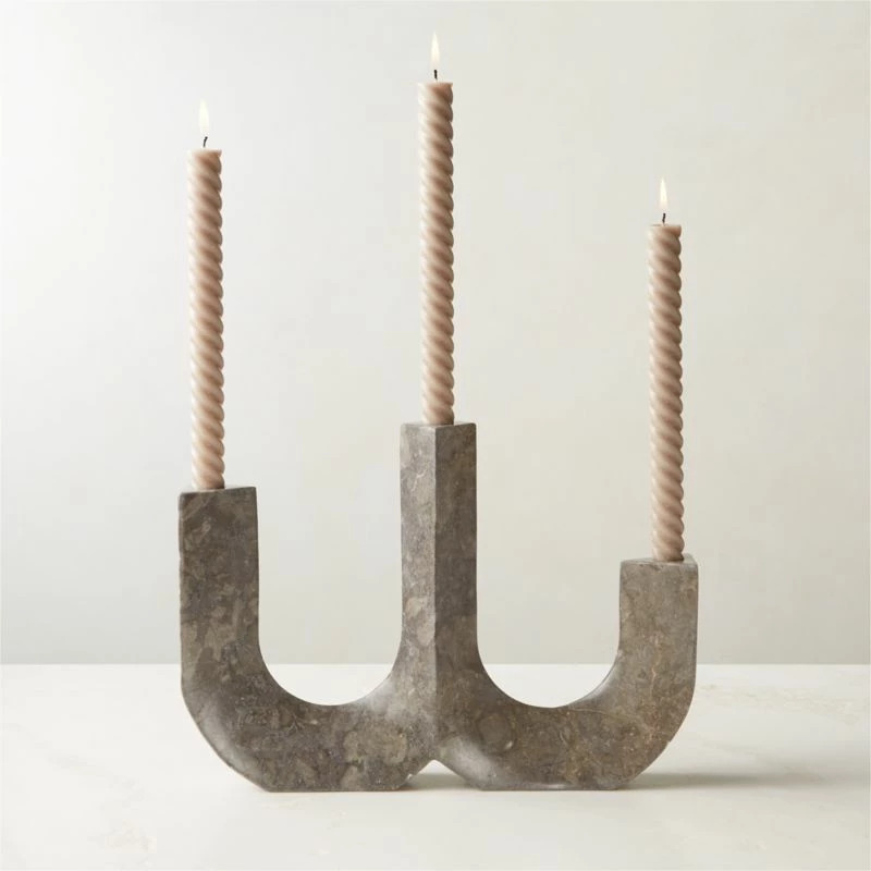 Crafted from light grey marble sourced from Indonesia, this taper candle holder is carefully cut and shaped by hand to create its distinctive silhouette. Sized to accommodate three taper candles, it also doubles as décor. Due to the natural characteristics of marble, each piece will be unique. CB2 exclusive.