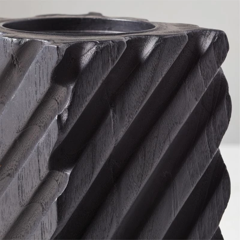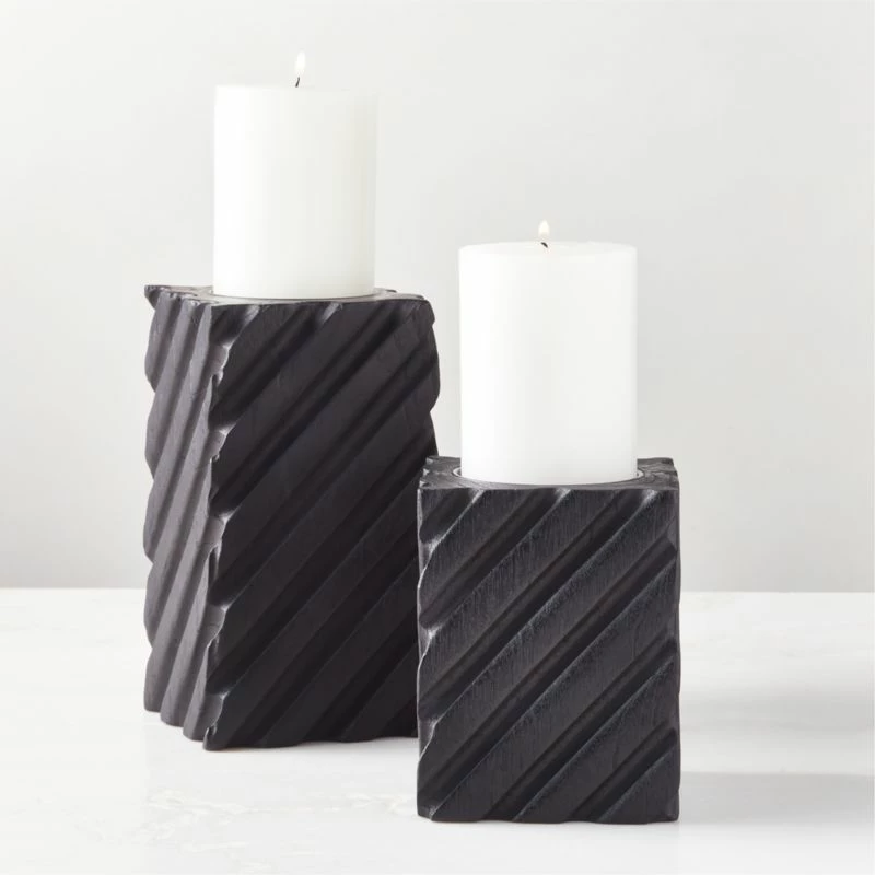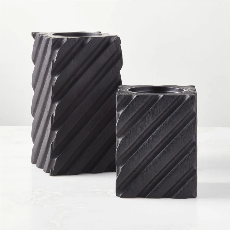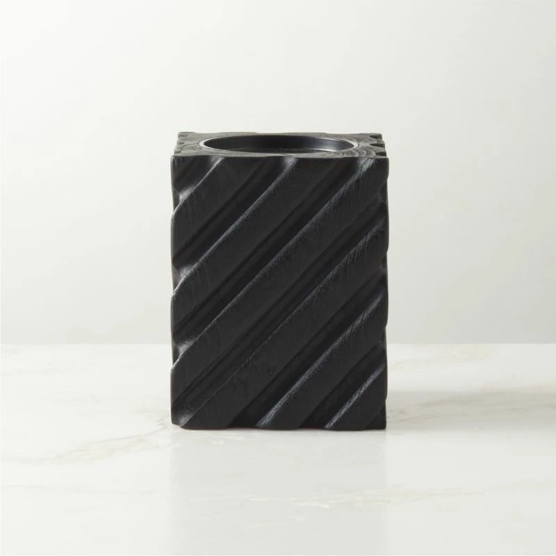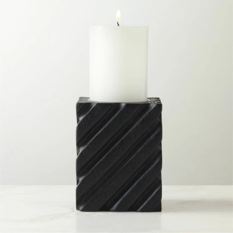 Inspired by Brutalist design, square teak candle holder merges organic texture with sculptural curves for a refined look that complements any setting. Rich blackened finish enhances the variations in the wood’s grain, making each piece naturally one of a kind. Geometric form is striking on its own or when displayed in groups for an eclectic candlescape. CB2 exclusive.
